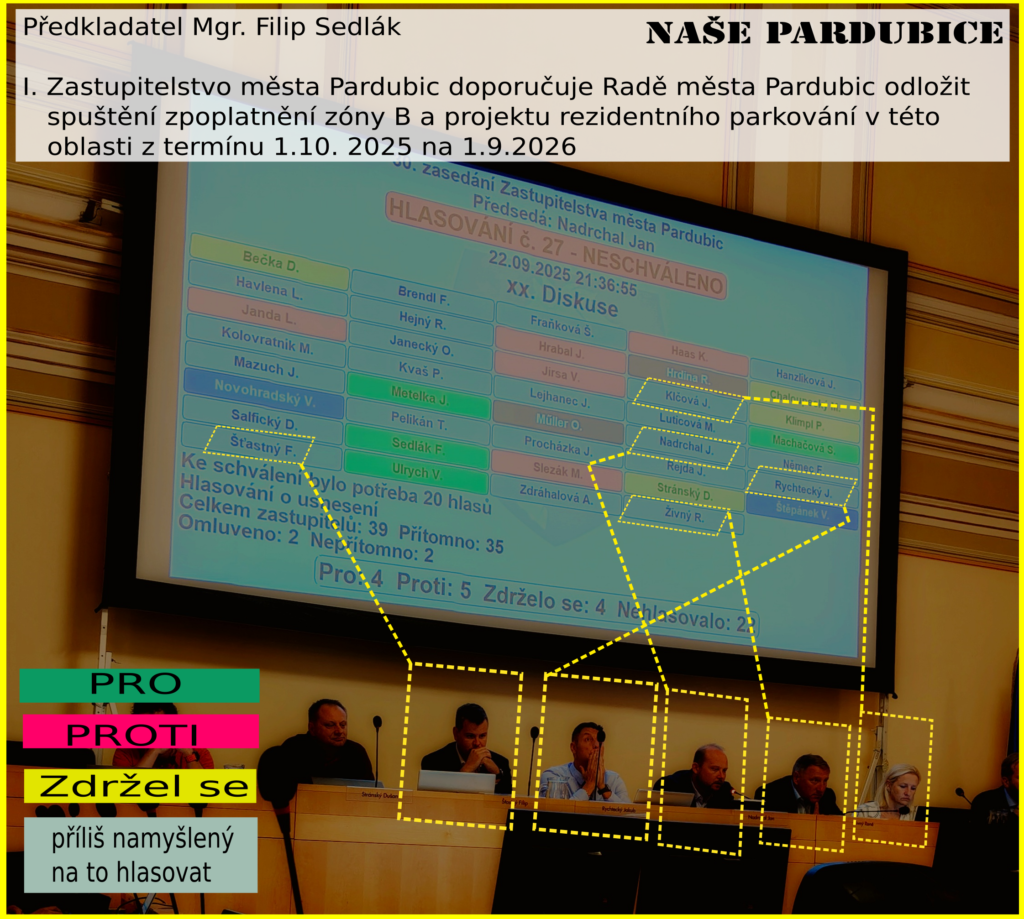 Následně podal Mgr. Filip Sedlák dva návrhy. V prvním chtěl, aby se o rok odložilo toto spuštění rezidentního parkování.